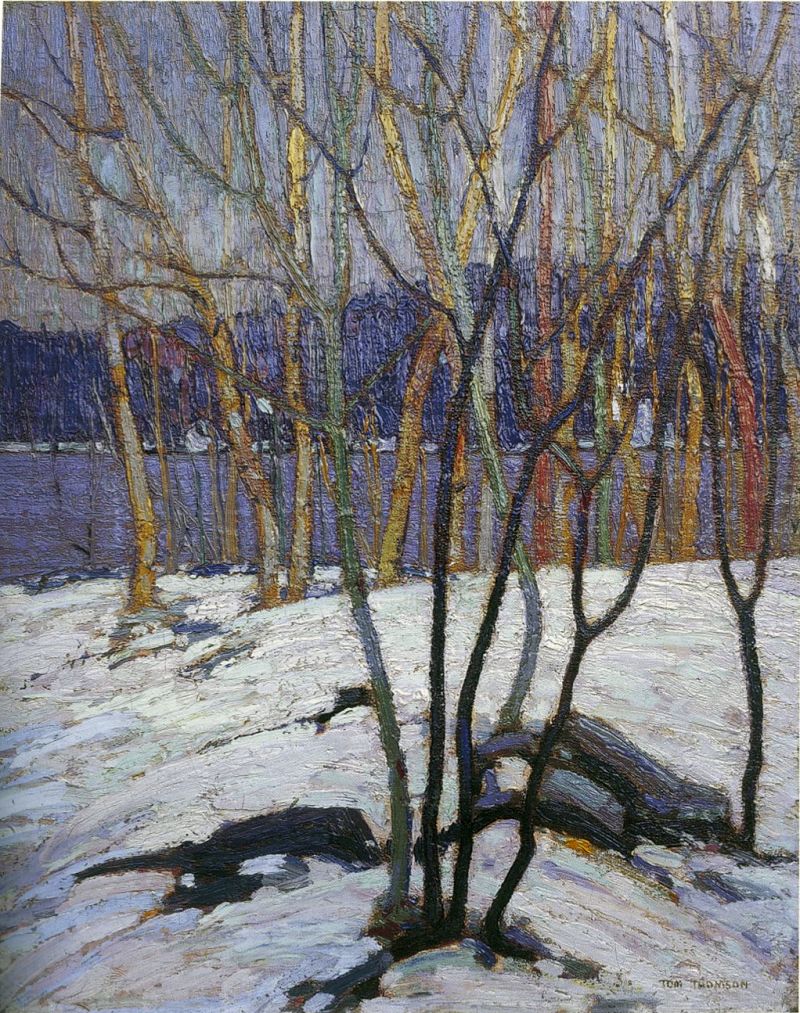 Other titles under which the work has been known include Thirty Birches, a title given because it was no. 30 in an exhibition (G. Blair Laing in conversation, 4 April 1985), Silver Birches and Birches, Algonquin Park. Thomson painted the sketch for Evening, Early Spring in the spring of 1916, so he would have painted the canvas the following winter; hence, the date.